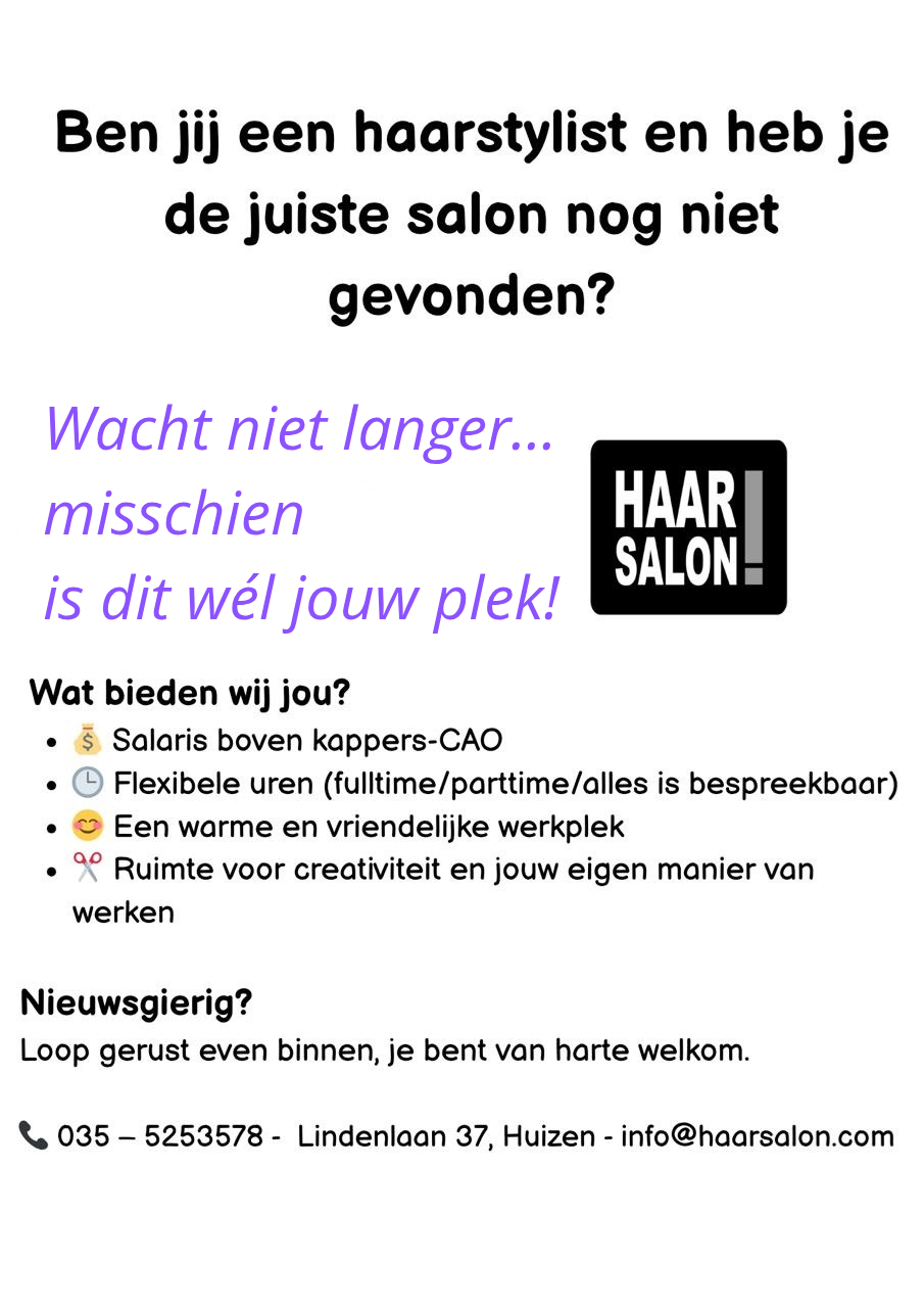 Lijkt het jou leuk om bij ons te komen werken neem dan contact op via info@haarsalon.com of bel naar 035-5253578 en vraag naar Jose of Linda P.